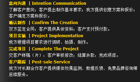 保證力——作業流程 我們一直相信,只有科學、規(guī)范的作業流程作為運作保障,優(yōu)秀的創意才能得以完美的實施。在經典影視,我們一直秉承——策略精準 . 創意新銳 . 執(zhí)行出色。